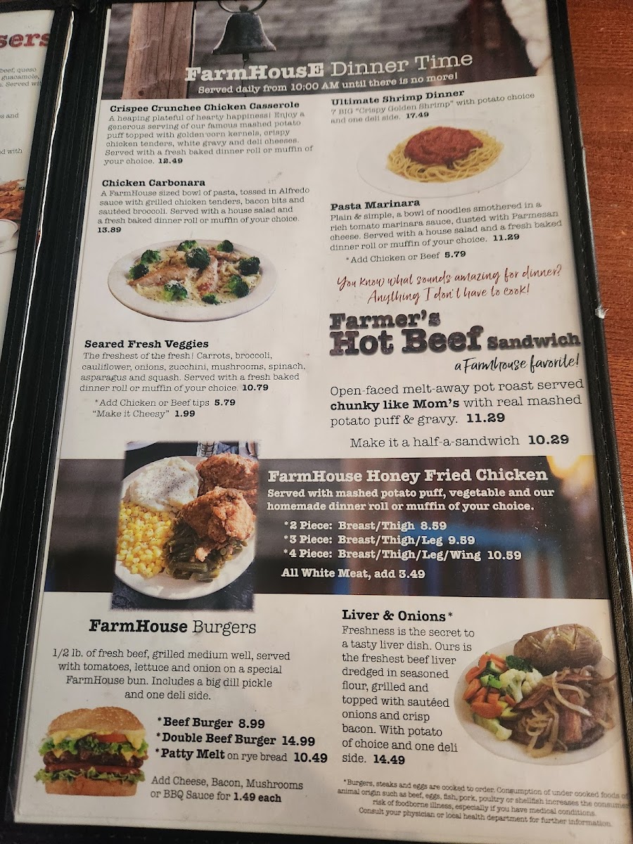 Start your day with warm, satisfying mornings staples like the Country Smoked Ham'n Eggs or a freshly baked cinnamon roll, perfect alongside a cup of coffee. For those midday or afternoon visits, expect comforting options such as the Chicken Pot Pie, Chicken Carbonara, or a fresh side salad to complement sandwiches like the bblt or the Potato Chip Chicken Club.